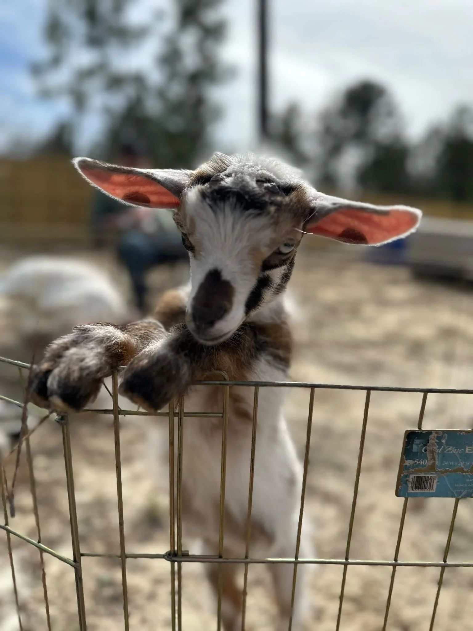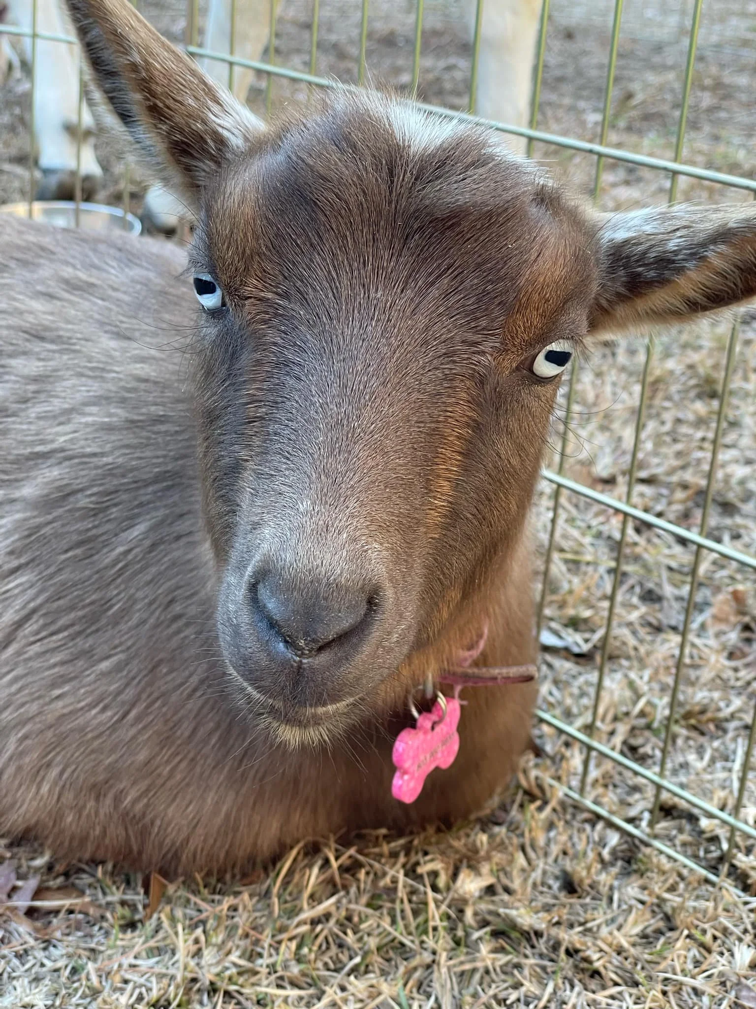 My name is Maggie aka Maggie moooo. I was born February 18th, 2024. I am a Nigerian dwarf goat. I was a bottle baby too from muddy boots farm and got to wear diapers and onesies and sleep in the bed with my mommy! She had to kick me outside once I figured out how to jump onto the kitchen counter and started eating her house plants! She originally got me because Marge wouldn’t stay inside the pins at events and wanting a goat that would but guess what, I DONT EITHER!!! So now mom is stuck with both of us being bad. I know she loves it though!! So, you’ll usually seeing me running around and hanging around the area at events too. I won’t run off because I am a momma’s girl. Sometime Marge and I will get along but most the time we like to head but each other and not listen. Don’t leave your door open when I am there because I will go inside and my first stop will be the kitchen! One time I went missing at an event and guess where they found me? In the birthday girls’ room with her and all her friends, eating chips. I don’t know why my mom made me leave her room. We were having so much fun!